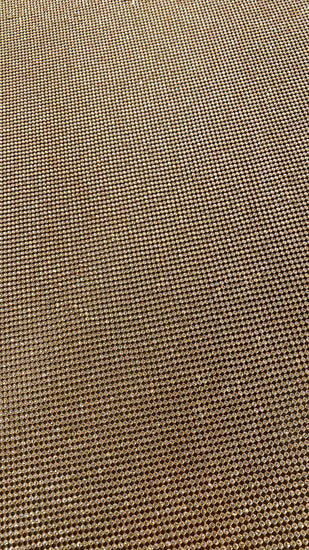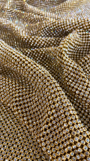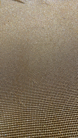 A medium weight, (for rhinestone mesh) semi-sheer, no give rhinestone mesh with sparkly gem appearance, cool, metallic handle and sound with minimal drape.