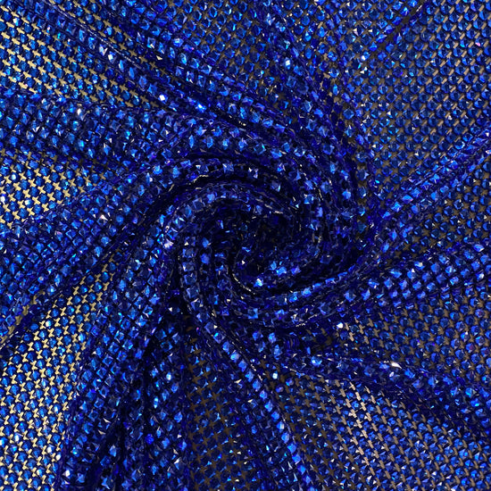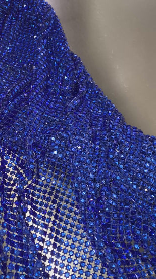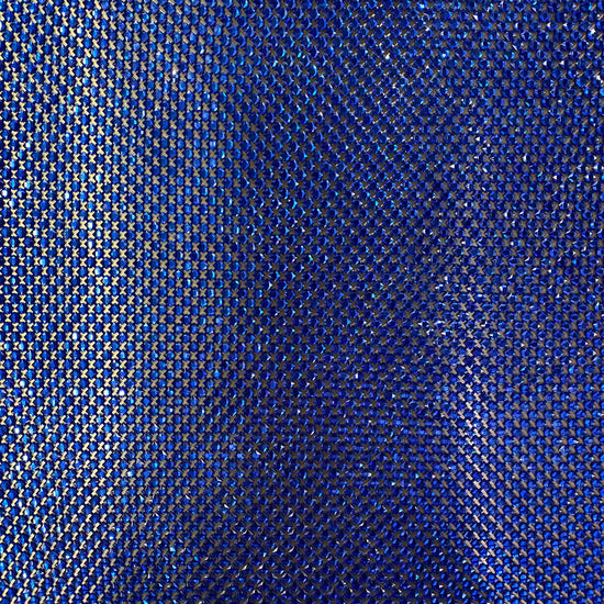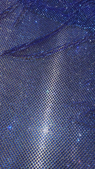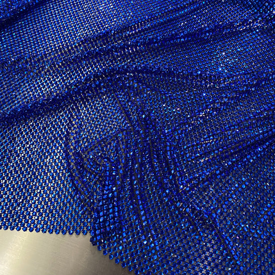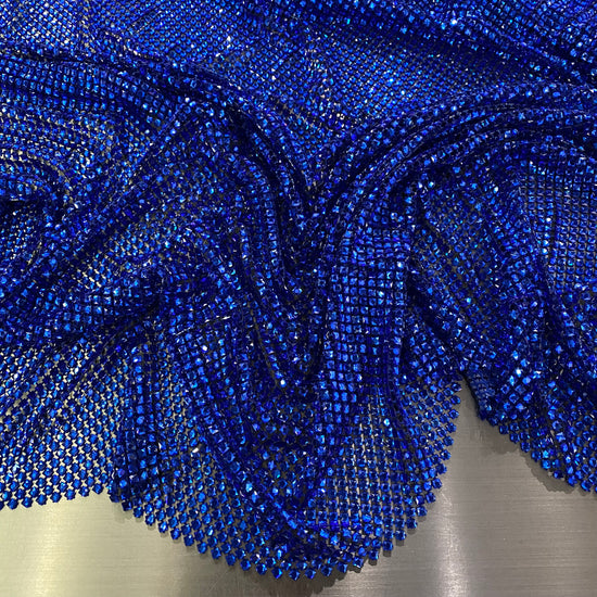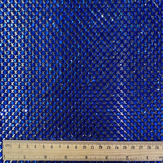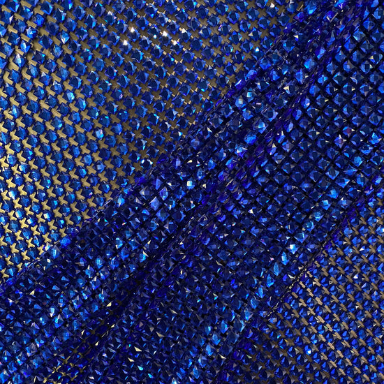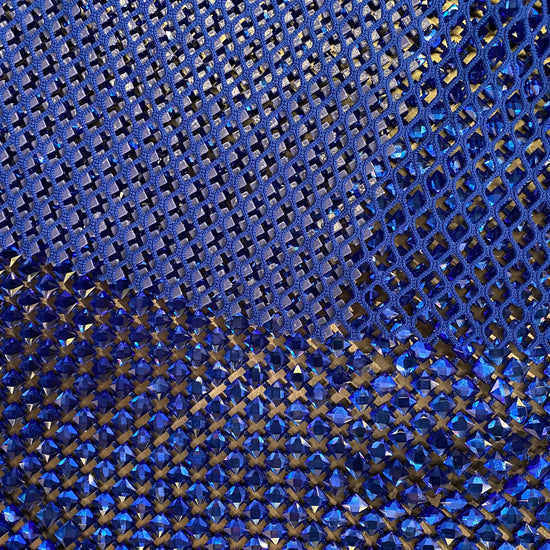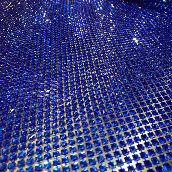 Stretchy polyester fishnet mesh adorned with 5x5mm bevelled square glass rhinestone crystals resembling the shape of princess cut diamonds. Each piece weighs approximately 3-4kg. Two-way stretch.