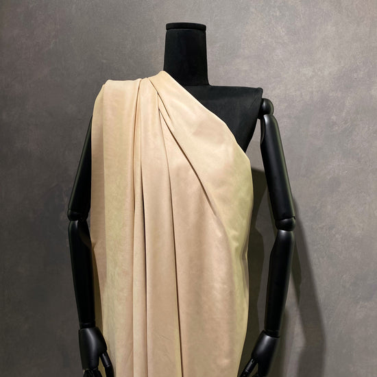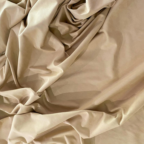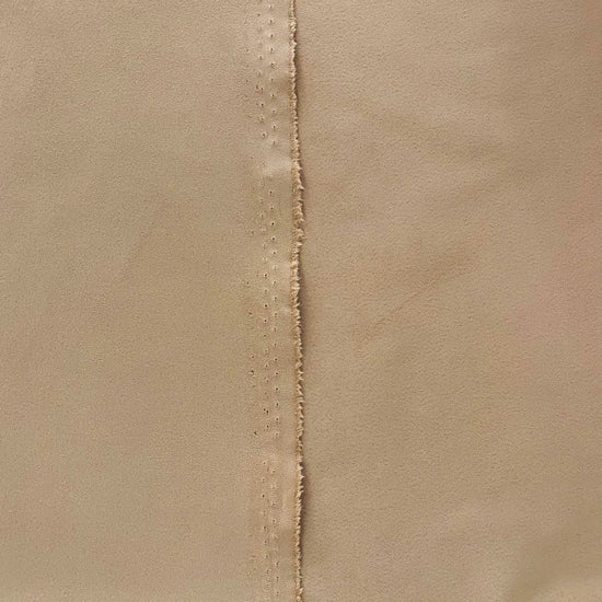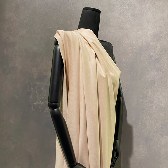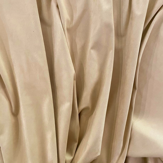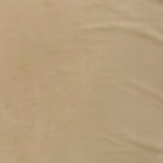 Polyester-spandex faux suede knit in Bisque or Wheat. This medium weight fabric is a double jersey knit structure with a faux suede napped finish. It has bouncy drape and good stretch along the weft, slight stretch in the warp.