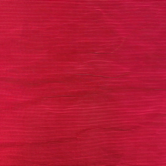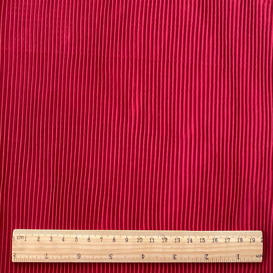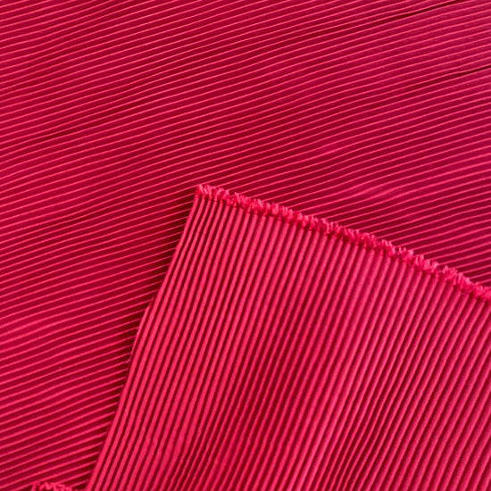 Fairly stiff but very stretchy, accordion-pleated crimson taffeta. Light to medium weight with a smooth, papery handle. Holds it’s shaped well for structural pieces.