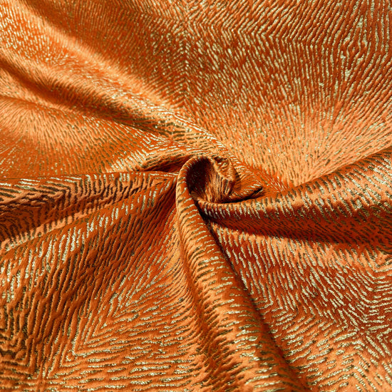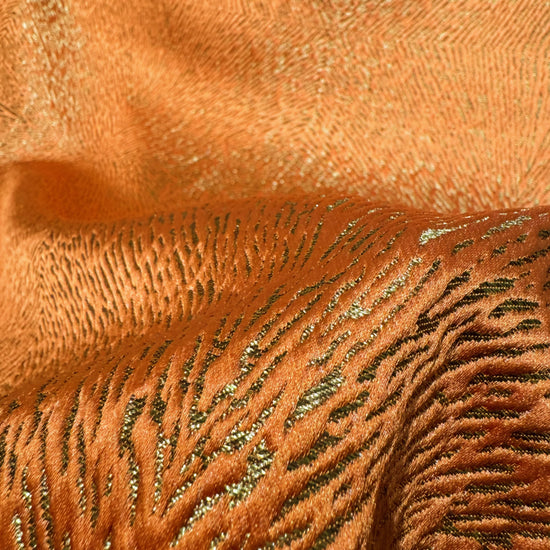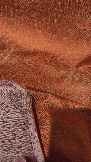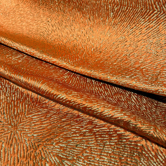 A medium to heavy weight, opaque, no give, damask with soft, textured handle, densely patterned appearance with slight sheen and minimal structured drape.