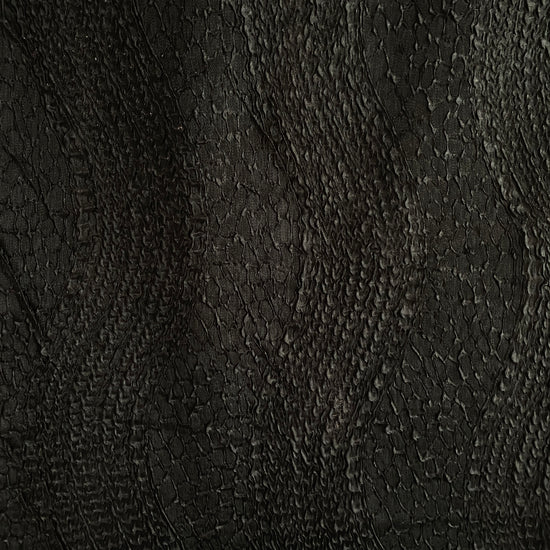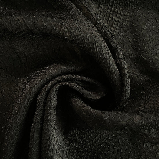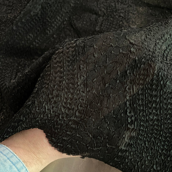 A black polyester satin faced organza with a repeating wavy bubbly heat-set texture, appearing as tire tacks, snakeskin, or wind erosion on sand. Light to medium weight with a bouncy, voluminous drape and semi-transparent coverage. There is moderate give in the weft direction due to the pleating manipulation, and no give in the warp direction.