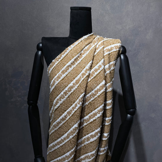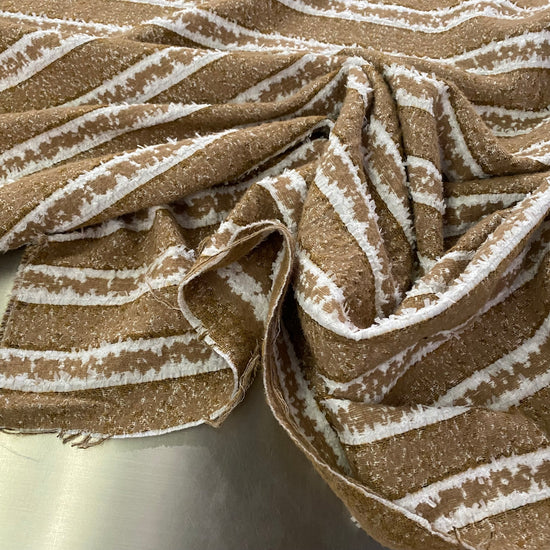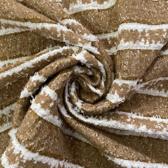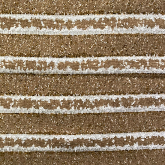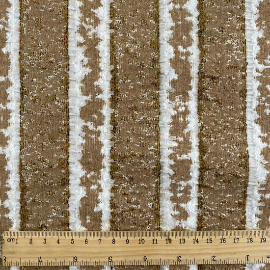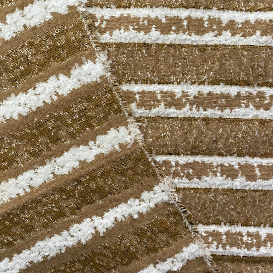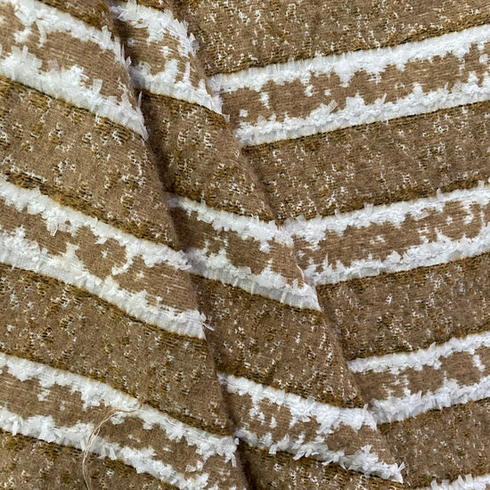 A medium weight, opaque woven fabric with cut non-woven ribbon yarn creating a fringed stripe on the face of the fabric. The brown yarn is napped giving the fabric a fuzzy, soft handle. No give in either directions.