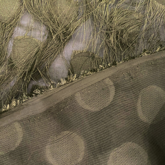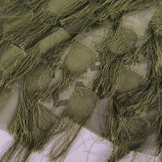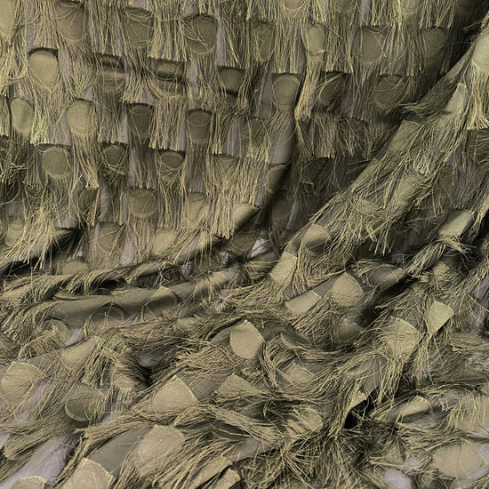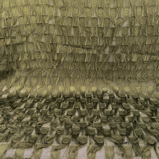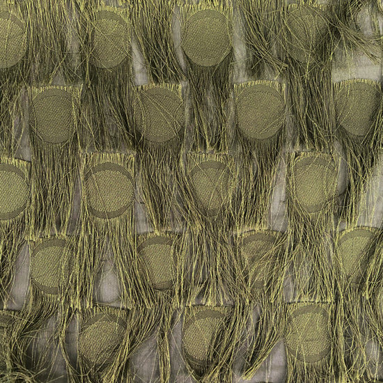 A soft, sheer chiffon with cut pile dobby fringed dots running in consistent rows, creating a light feathery appearance. It has a good flow and drape.