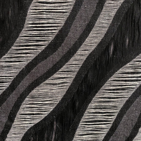 Cotton denim twill weave fabric with wave shape diagonal motifs woven with alternating twill and plain weaves of different tensions, creating different shades of dark and light grey. Alternating on the technical face of the fabric are sections of yarn float, or fringe secured on both ends, measuring between 25mm to 80mm in length. Heavy weight, structured drape, opaque coverage, tactile handle, and no give in either direction.