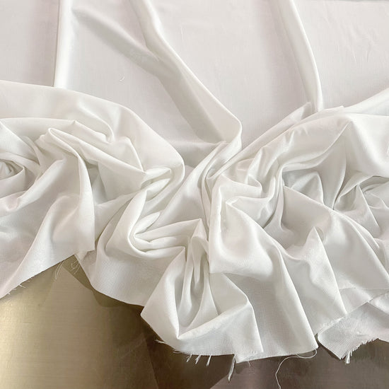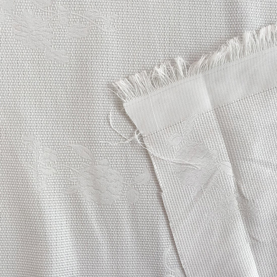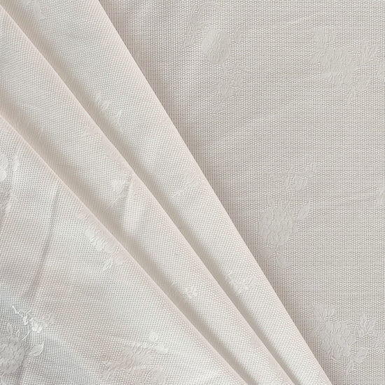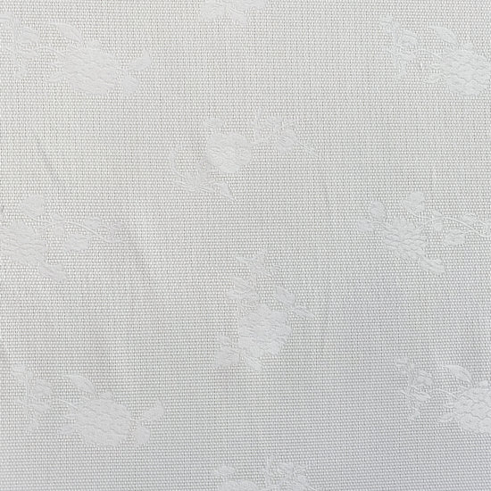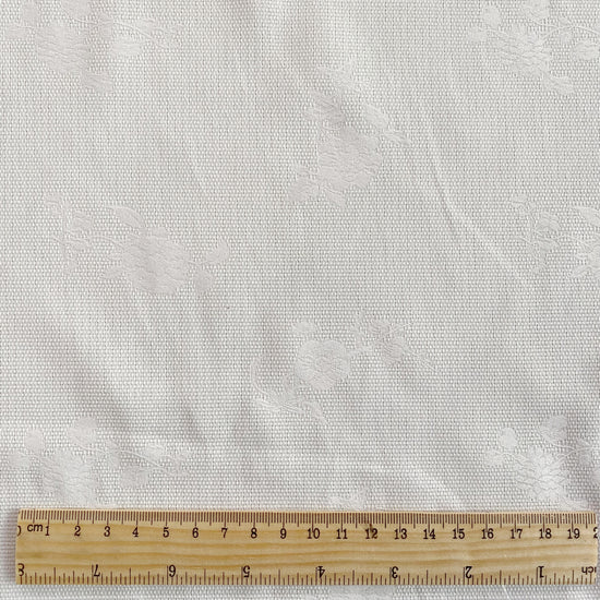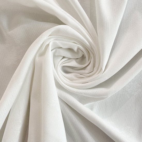 Polyester duck basket weave in White. This medium weight fabric has a thick duck basket weave with woven rose/bamboo motifs, a subtle sheen, and a textured handle. It has a soft drape, opaque coverage, and no stretch.