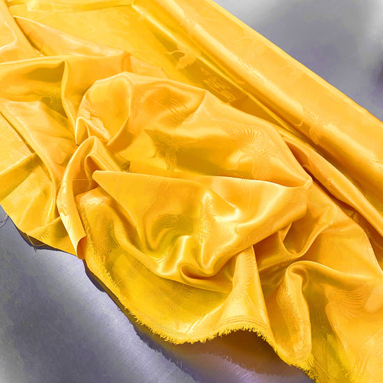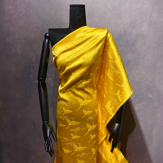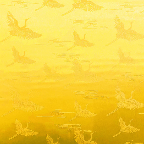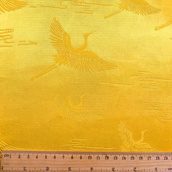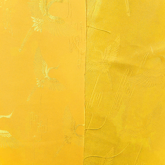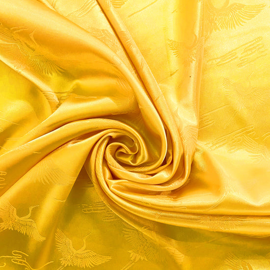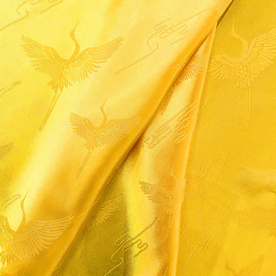 Silk-polyester blend satin jacquard in Yellow. This medium-to-lightweight fabric has a fine satin jacquard weave, featuring Traditional Chinese crane motifs, a lustrous sheen and a smooth handle. It has a fluid drape, opaque coverage, and a slight ease (of stretch) across the selvedge.