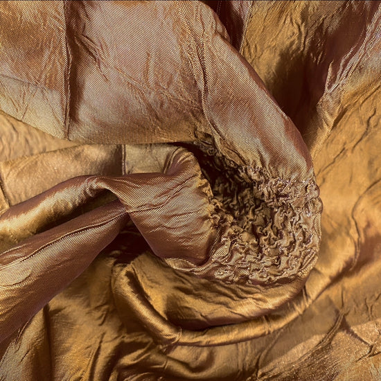 Polyester poplin in Gold. A light weight fabric with a tight taffeta weave, shot-metallic lustre, and a ruched geometric motif. It has a structured drape, opaque coverage, and no stretch.