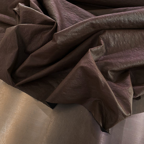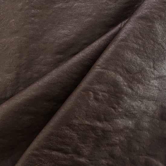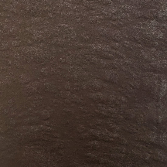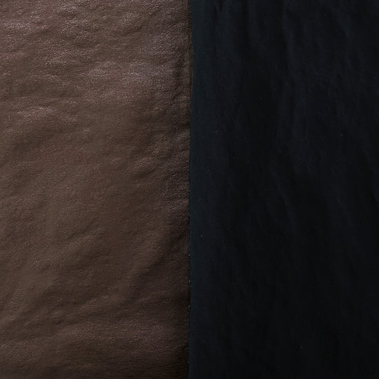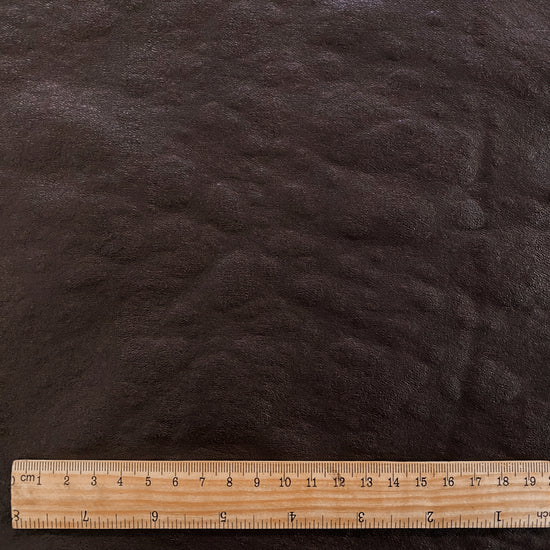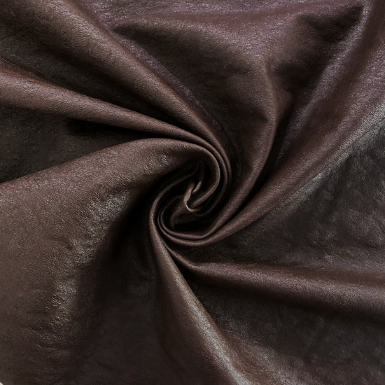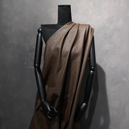 Black polyester twill base with a brown PU coating with a muddy, earthy, dirty grunge texture. Slightest amount of give in the weft direction with good elastane stretch in the warp direction. Heavyweight with a bouncy, stiff drape, and a grainy, slightly crisp handle.