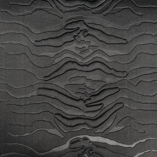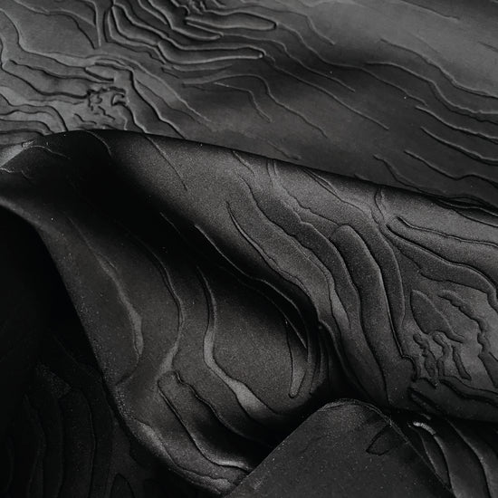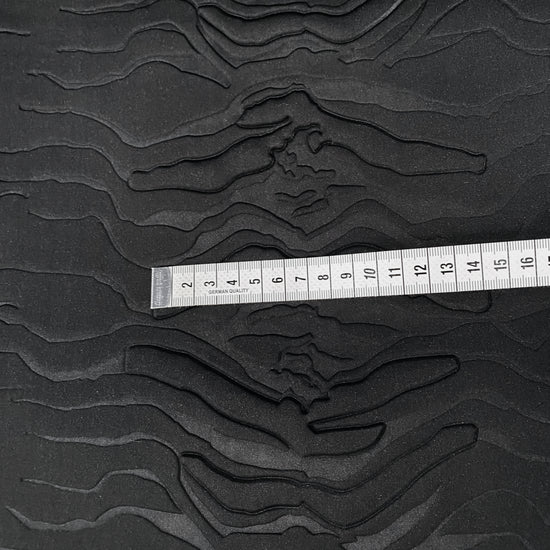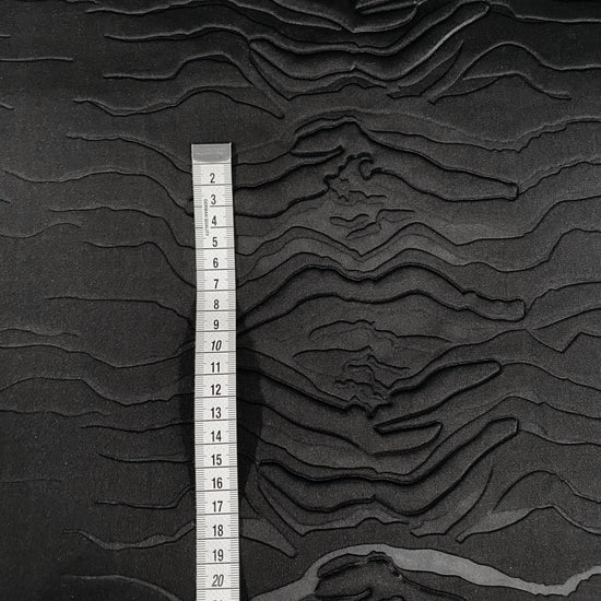 A medium weight, semi-opaque, embossed tiger stripe double knit, (neoprene-like) with a heavy drape and cushioned, smooth, lightly textured handle. Width: 145/150cm