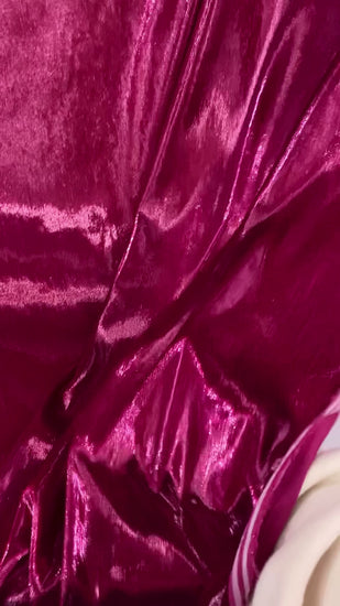 A light weight, opaque brushed metallic velvet with a long-pile, great drape, a very smooth, silky, cool handle, a shiny appearance and very minimal stretch in the weft direction.