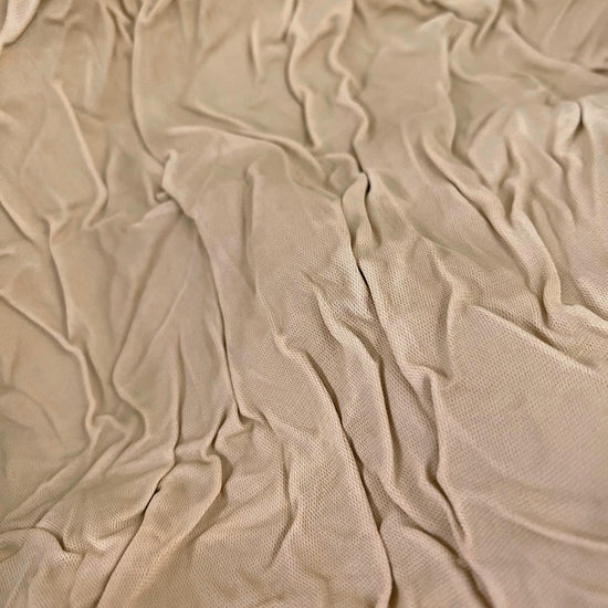 Polyester sateen in tan. This medium weight fabric has a tight sateen weave, and bonded with a crinkled handle. It has a semi-structured drape, opaque coverage, and no stretch. White bonded backing.