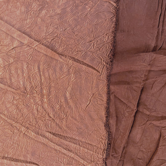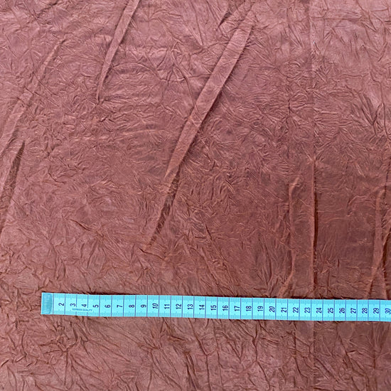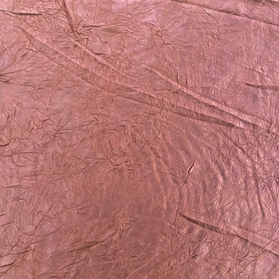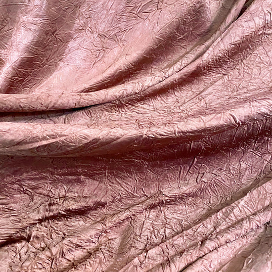 A medium weight, opaque, creased satin with slight give in the weft direction. It has a cool, smooth handle, shiny appearance, and a heavy, fluid drape.
