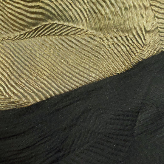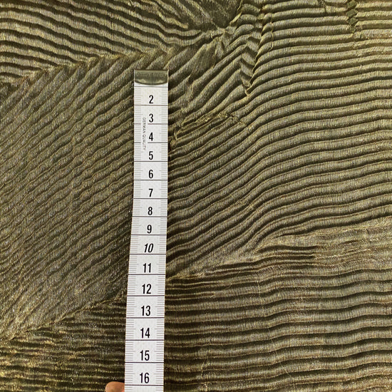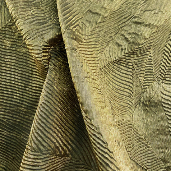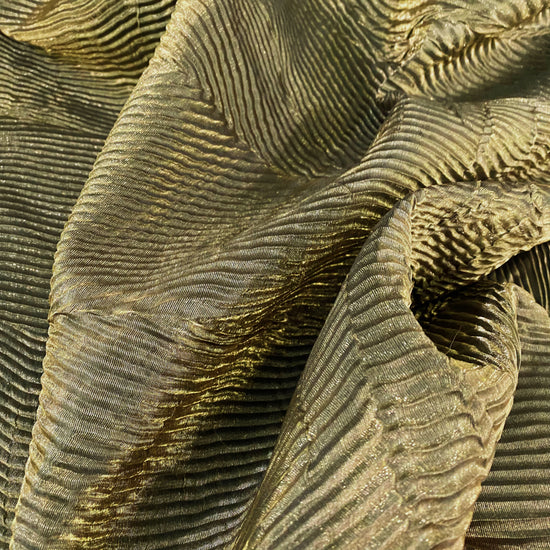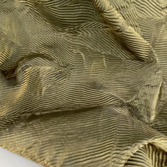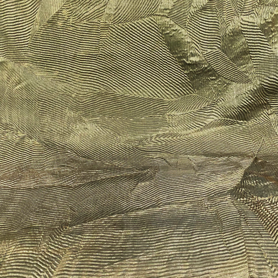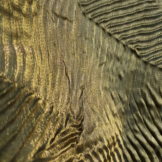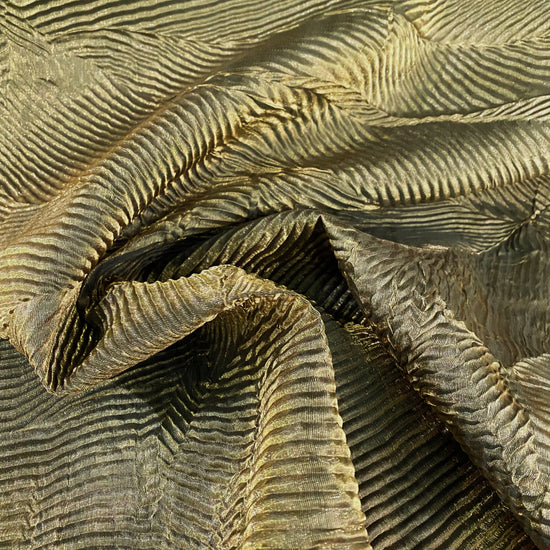 Bonded polyester satin in Dark Goldenrod. This lightweight fabric has a loose satin weave, treated with a multi-directional corrugated handle. It has a metallic sheen, a soft bouncy drape, opaque coverage, and no stretch.
