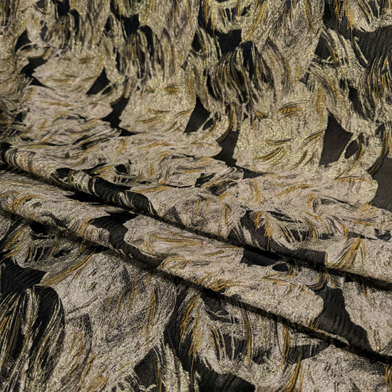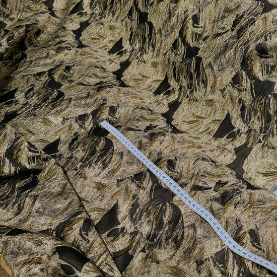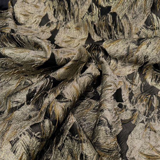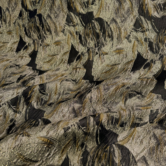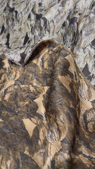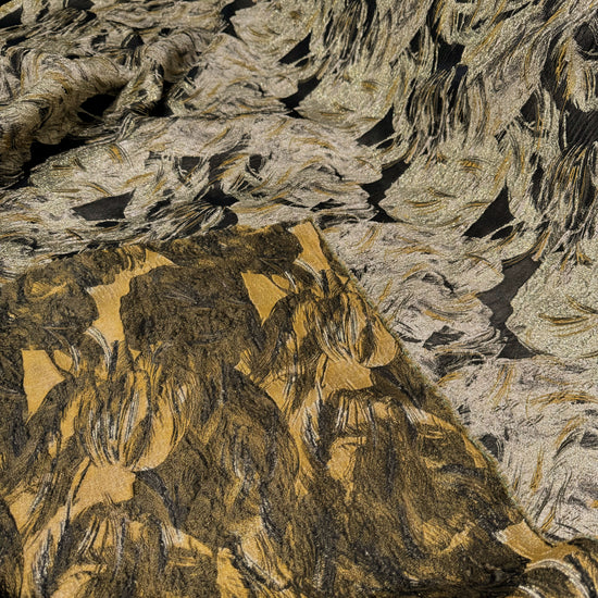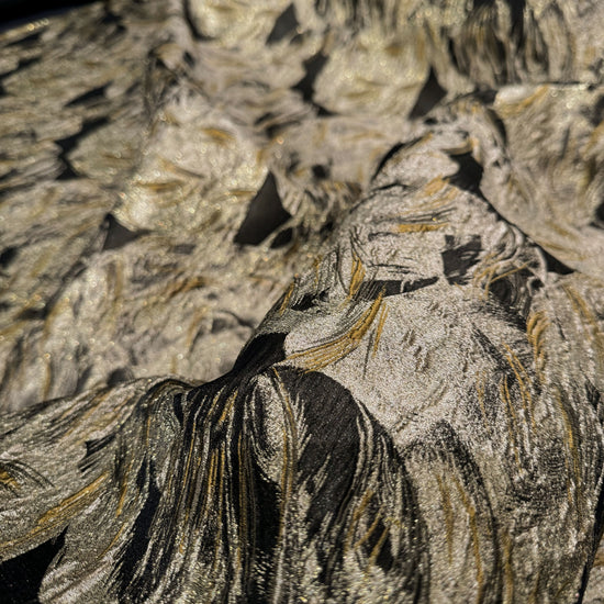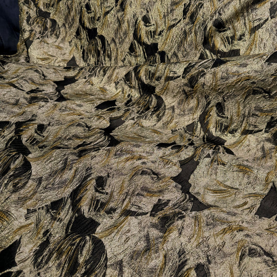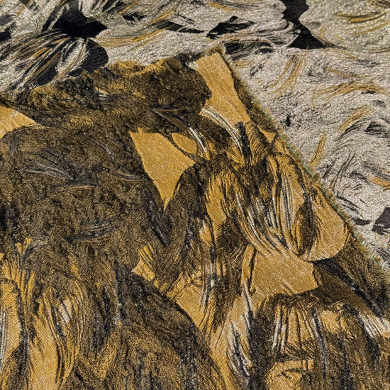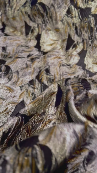 A medium to heavy weight, opaque brocade with textured, grainy, metallic handle, minimal drape, subtle metallic appearance and some give in the warp direction.