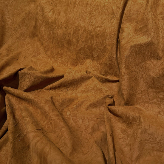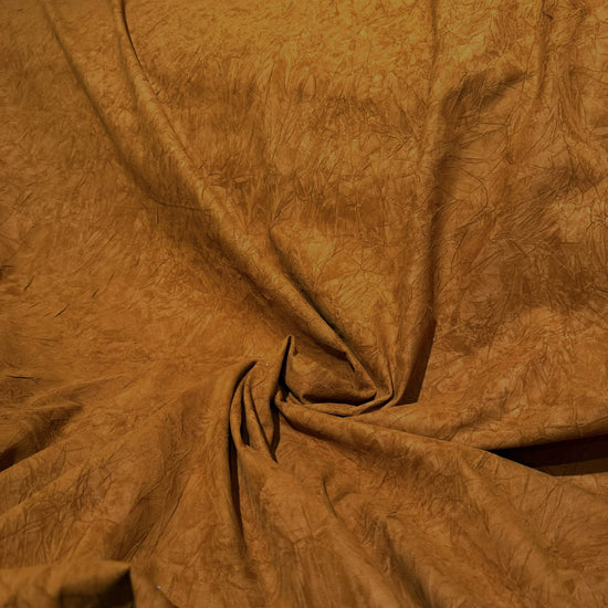 A light to medium weight, opaque, faux suede knit with tiny amount of give in both the warp and weft directions, velvet like handle, matte, creased appearance and minimal drape.