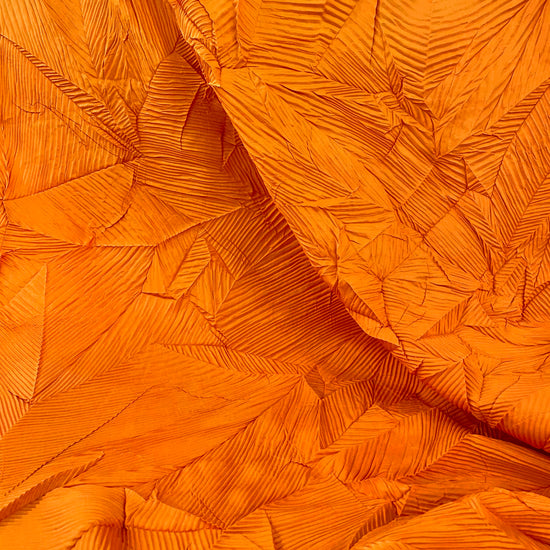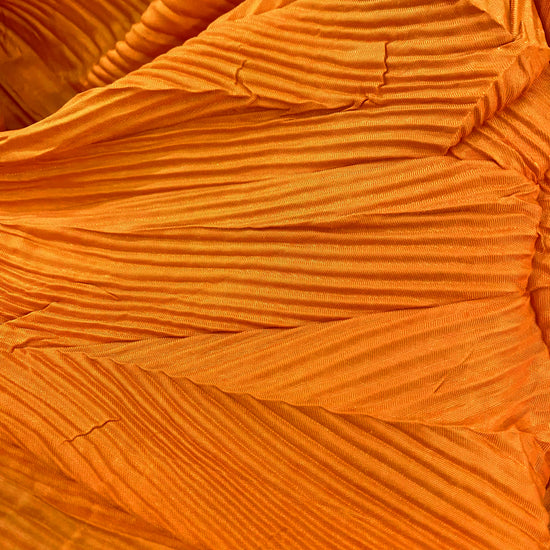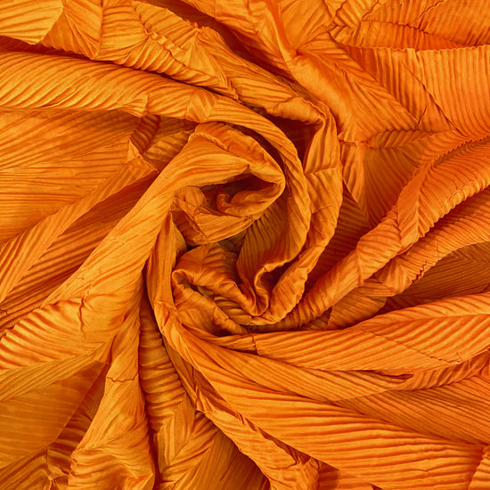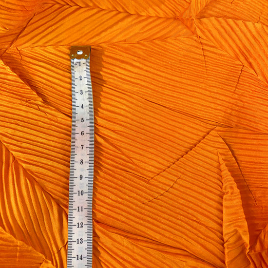 Soft pleated polyester with uneven pleated pattern running through it. It is a light weight opaque fabric with plain weave, has some drape to it which is limited by the pleated nature of the fabric.
