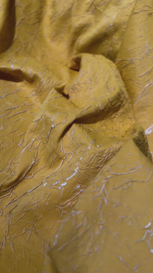 A light to medium weight, opaque, non give, bonded, hand-painted, creased sateen with a lightly textured, canvas handle, matte appearance, and a good, structured drape.
