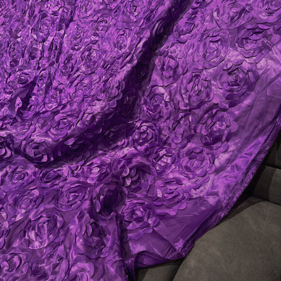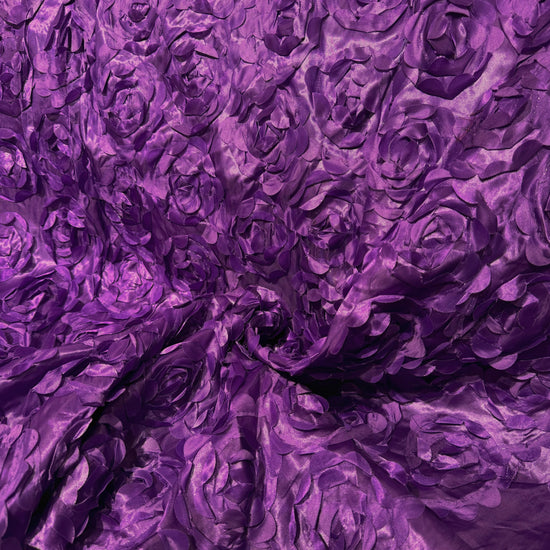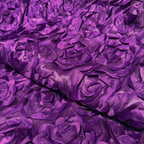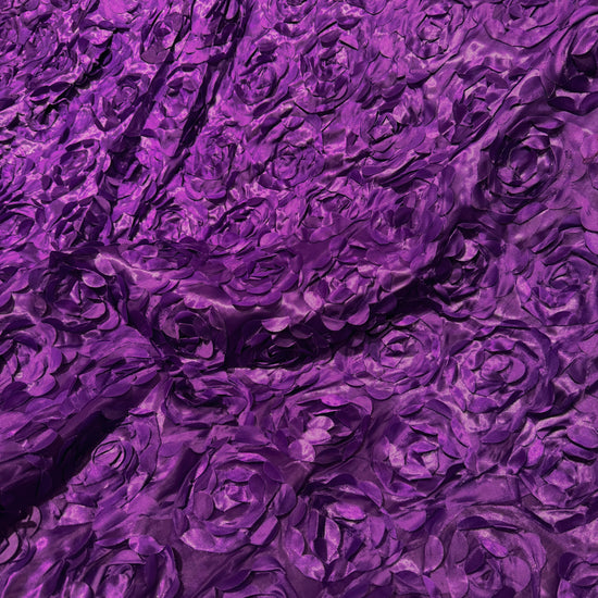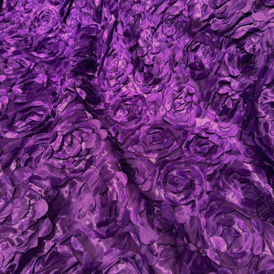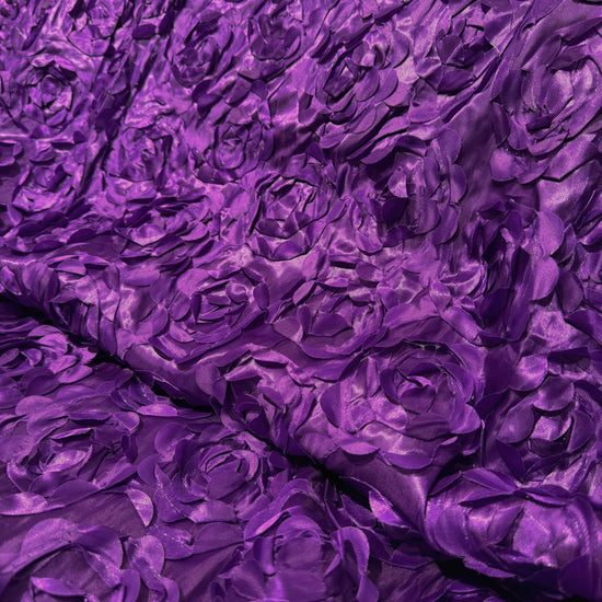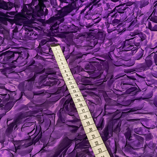 Polyester satin in purple. This medium-weight fabric features a tight, lustrous satin weave adorned with a sewn applique rose motif. It has a semi-structured drape, opaque coverage, and no stretch.