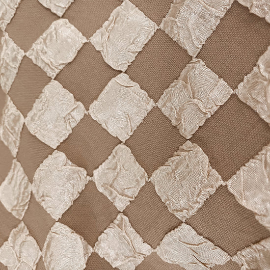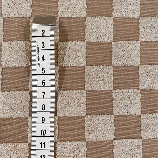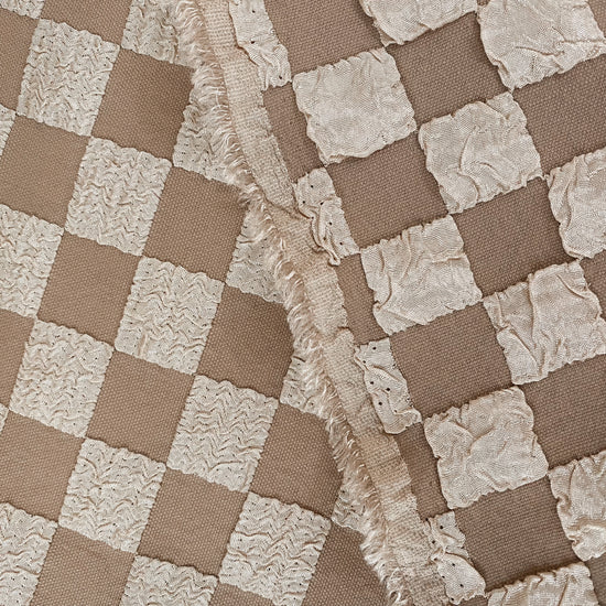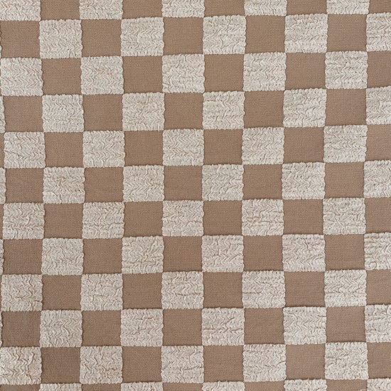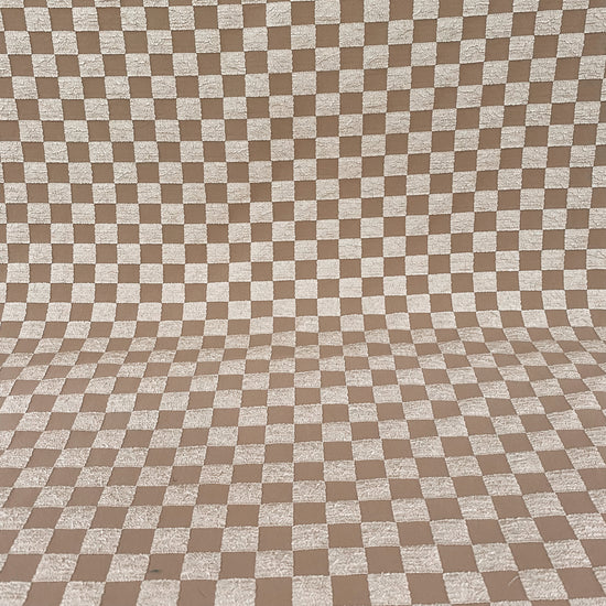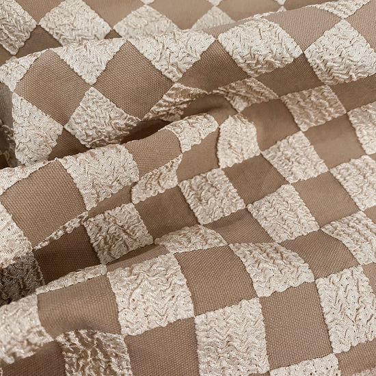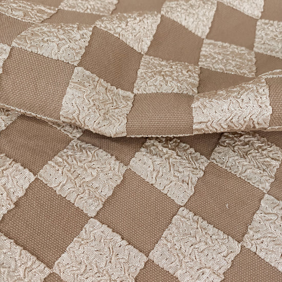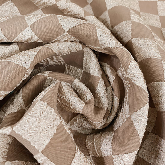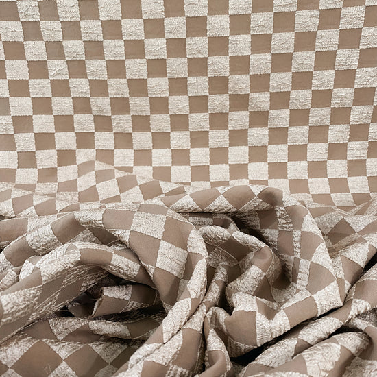 Polyester double weave in Rose Brown/Gold. This medium weight fabric has a tight double weave in a checkered motif with a shirred satin contrast. It has a soft drape, opaque coverage, and slightly stretches across the salvage.