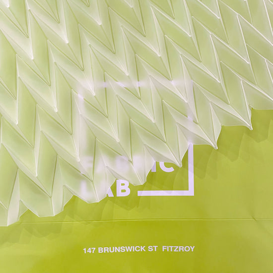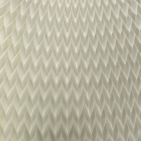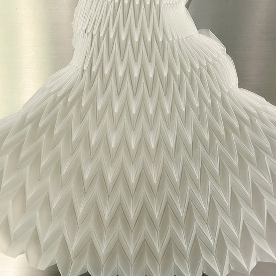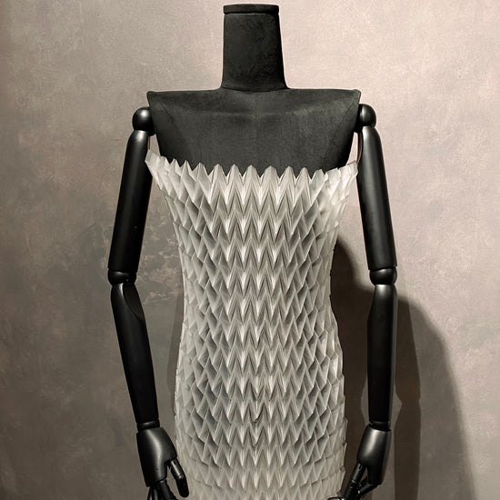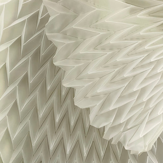Translucent polyvinyl material pleated into a chevron / zig-zag pattern. Non-woven, experimental fabric with springy, rubbery handle, minimal drape, no give, matte appearance.