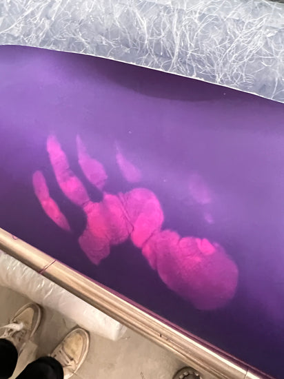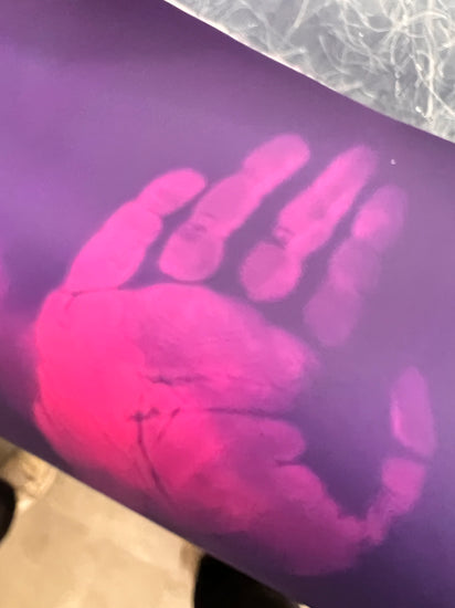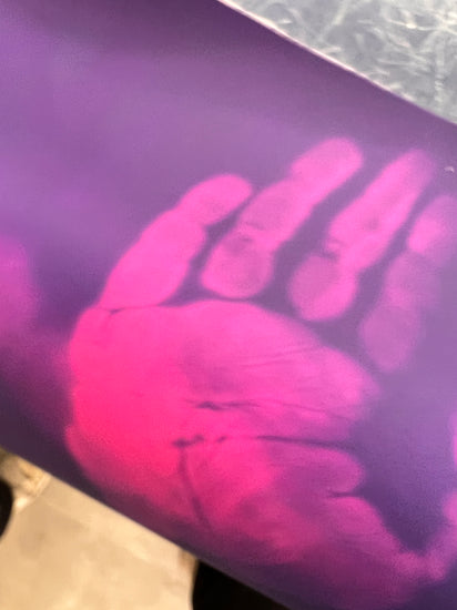 Cotton bonded PU in Purple/Pink. This heavyweight fabric has a smooth polyurethane surface, bonded to a cotton backing. It features thermochromic properties (temperature reactive 20°c > 30°c), morphing within an intermediate colour gradient from purple to pink. It has a structured drape, opaque coverage, and no give.
