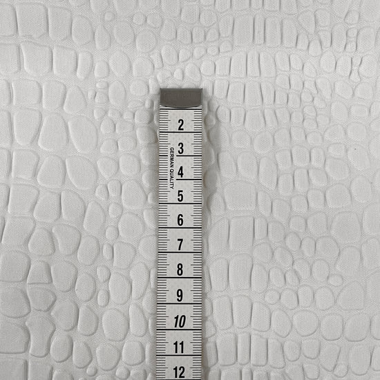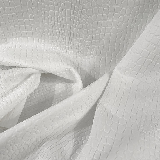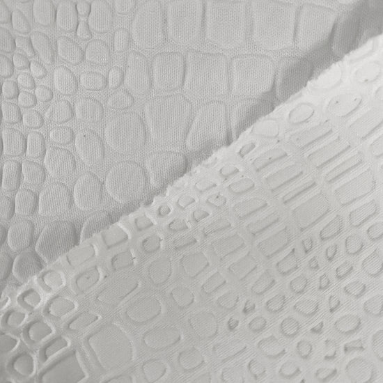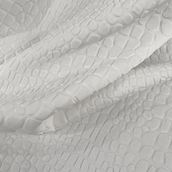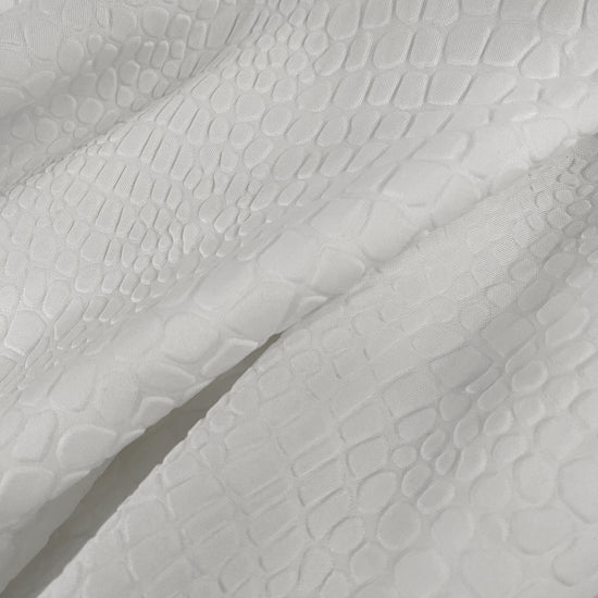 A medium weight, opaque, embossed crocodile print double knit with stretch in both directions, (a little more in the weft direction) good, structured drape and textured handle.