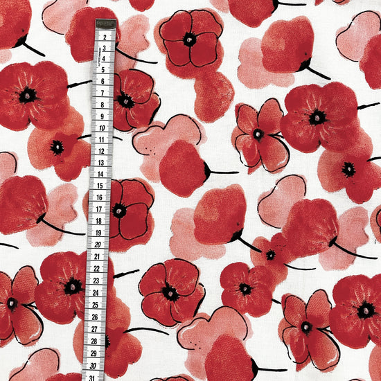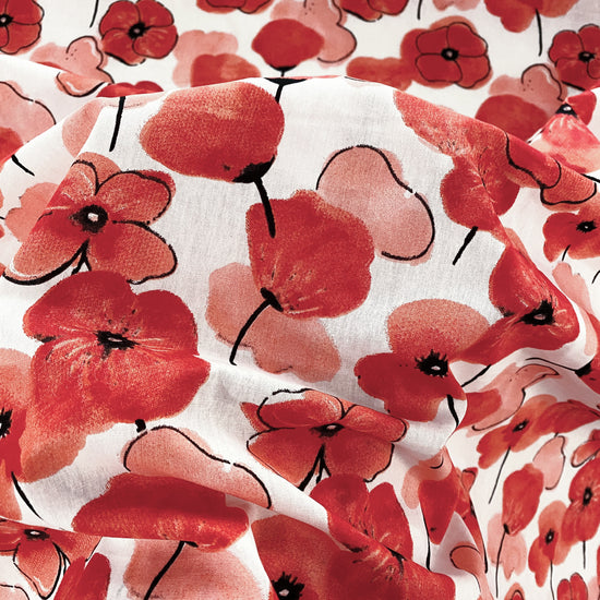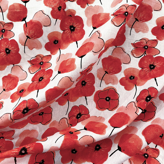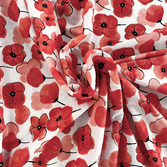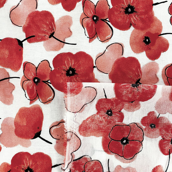 A light-weight, semi-opaque, no give poplin with light canvas handle, matte, flower motif and average drape.