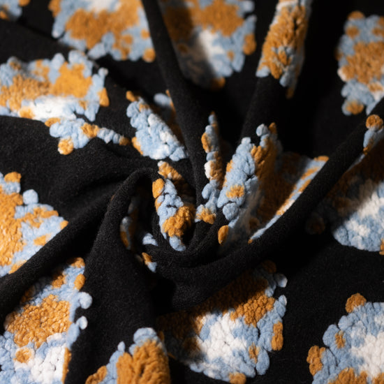 A medium to heavy weight, opaque intarsia pile knit with some stretch in the weft direction, soft, warm handle, matte appearance and minimal structured drape.