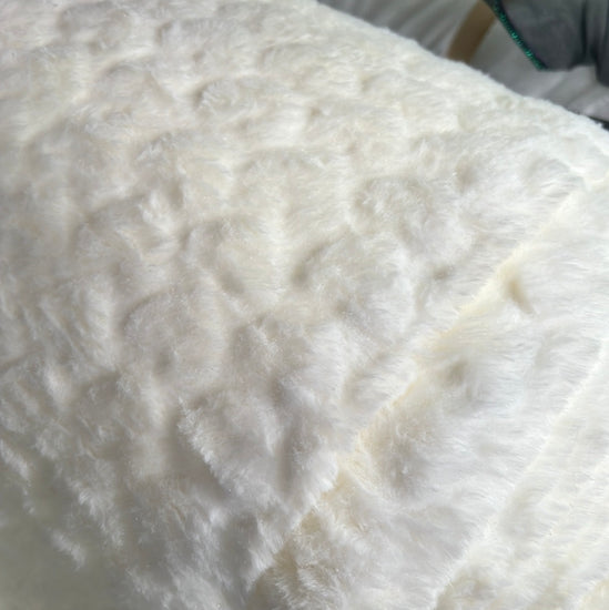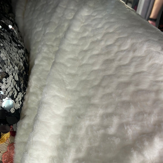 Polyester Faux Fur in White. This short hair heavyweight faux fur has a tightly knitted backing, with shaved heart motifs and a plush handle. It has a structured drape, opaque coverage, and no give.