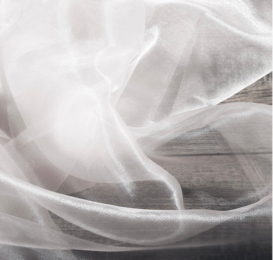 Polyester organza in White. This lightweight fabric has a fine plain weave with a grainy metallic lustre and a dry handle. It has a structured drape, semi-sheer coverage, and no stretch.