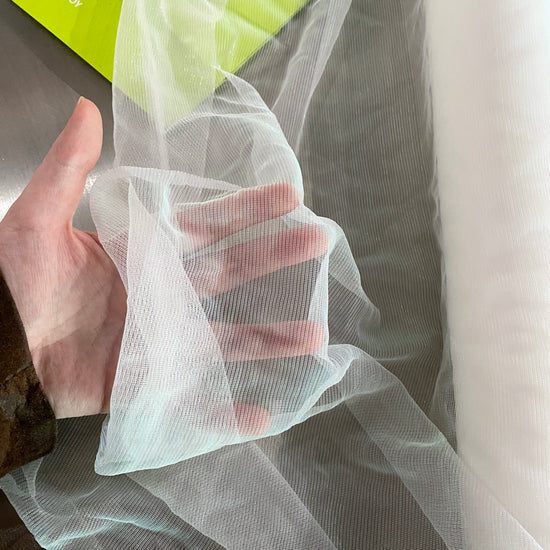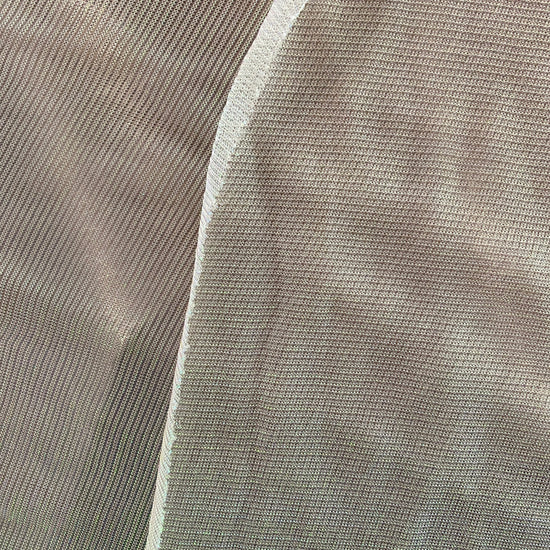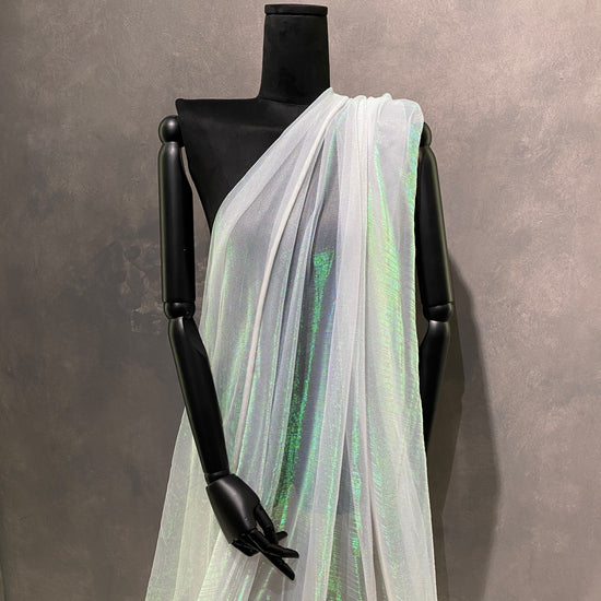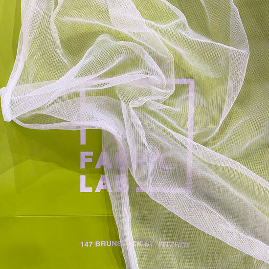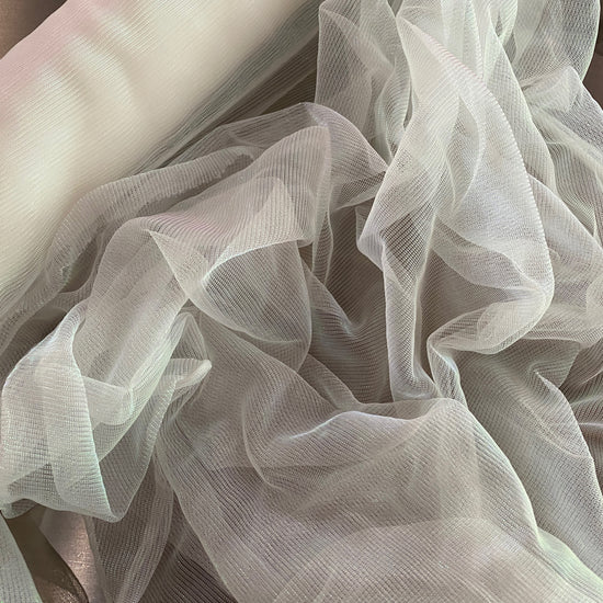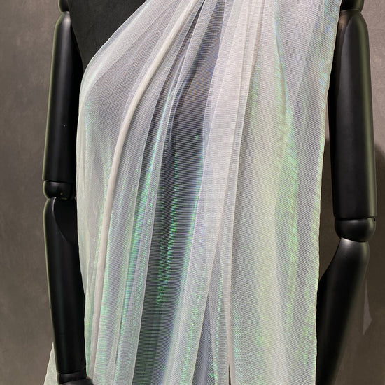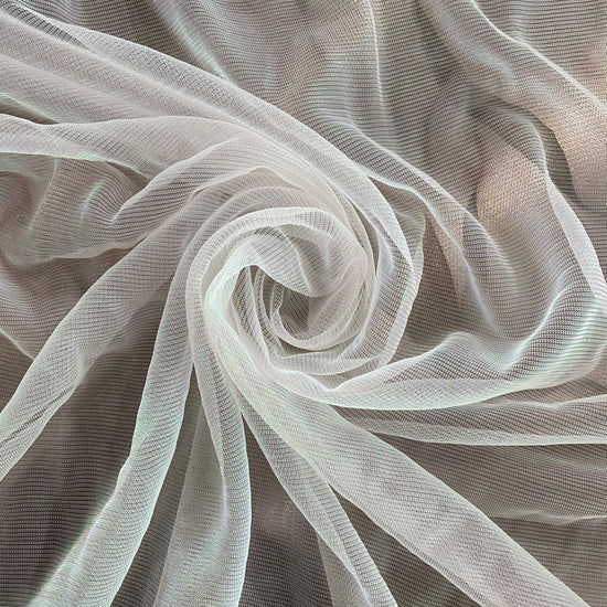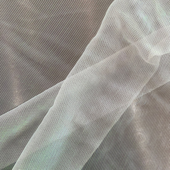 Polyester raschel knit in White / Holographic. This light weight fabric has a loose raschel structure, with a ribbed handle and holographic lustre. It has a fluid drape, sheer coverage, and stretches across the salvage.