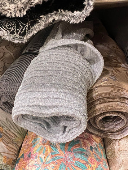 Polyester raschel knit in silver. This light weight fabric has a loose raschel structure, with a ribbed handle and glittery sheen. It has a fluid drape, sheer coverage, and stretches across the salvage.