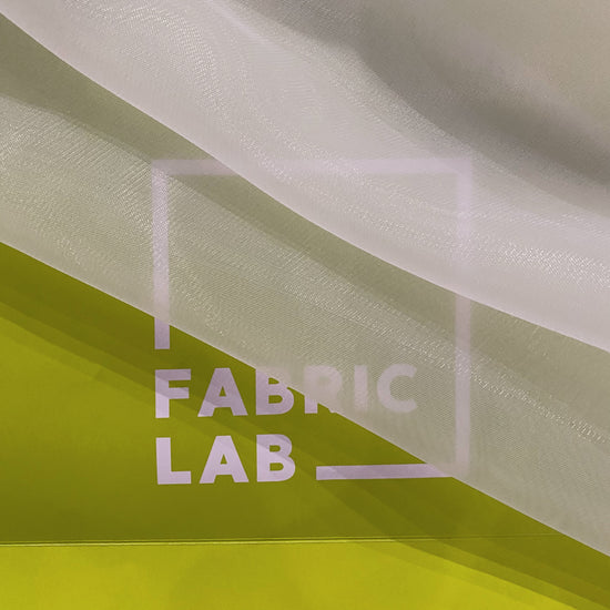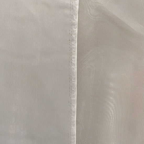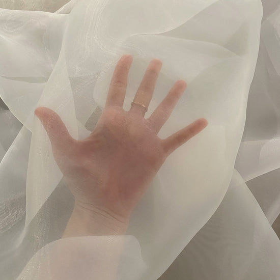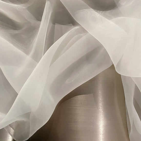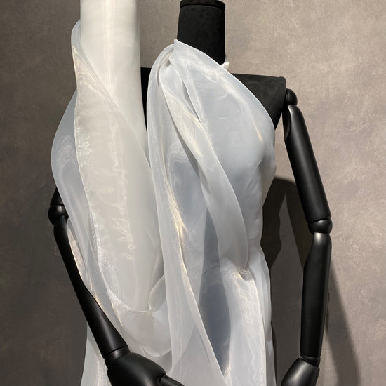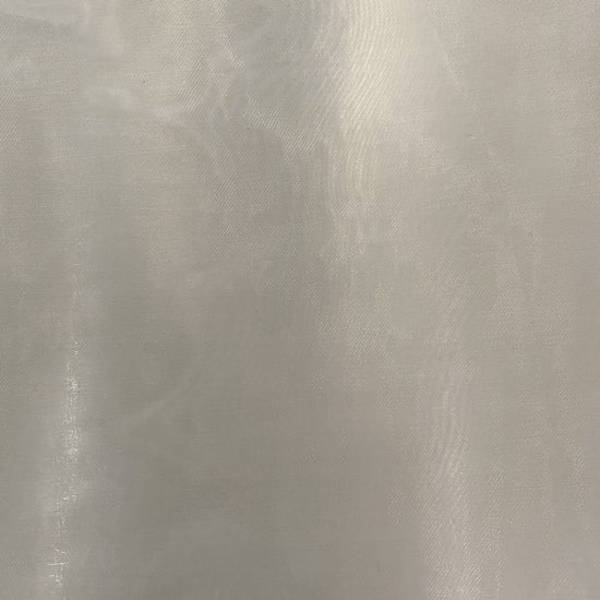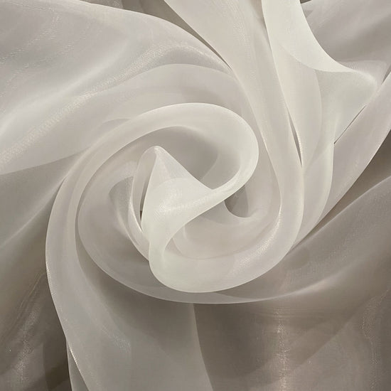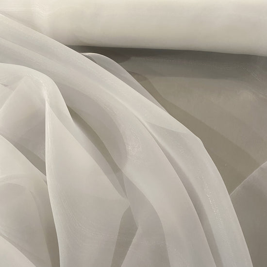 Polyester organza in White. This lightweight fabric has a fine plain weave with a liquid shimmering lustre, and a smooth handle. It has a structured drape with a bounce, semi-sheer coverage, and no stretch.