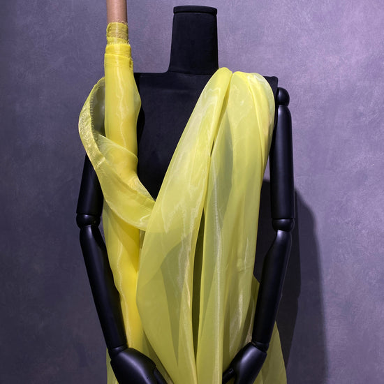 Polyester organza in Yellow. This lightweight fabric has a fine weave with a glossy lustre, and a smooth handle. It has an airy structured drape, semi-sheer coverage, and no stretch.
