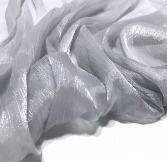 Polyester organza in Silver. This lightweight fabric has a fine weave with a grainy metallic lustre, and a fine pleated handle. It has an airy drape with a bouncy movement, semi-sheer coverage, and no stretch.