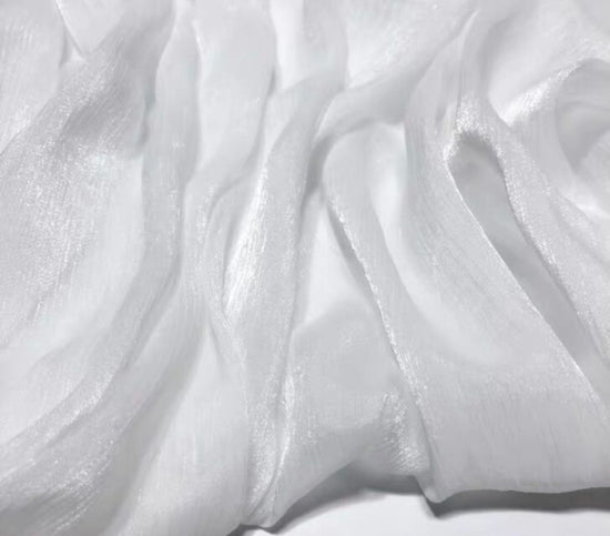 Polyester organza in White. This lightweight fabric has a fine weave with a grainy metallic lustre, and a fine pleated handle. It has an airy drape with a bouncy movement, semi-sheer coverage, and no stretch.