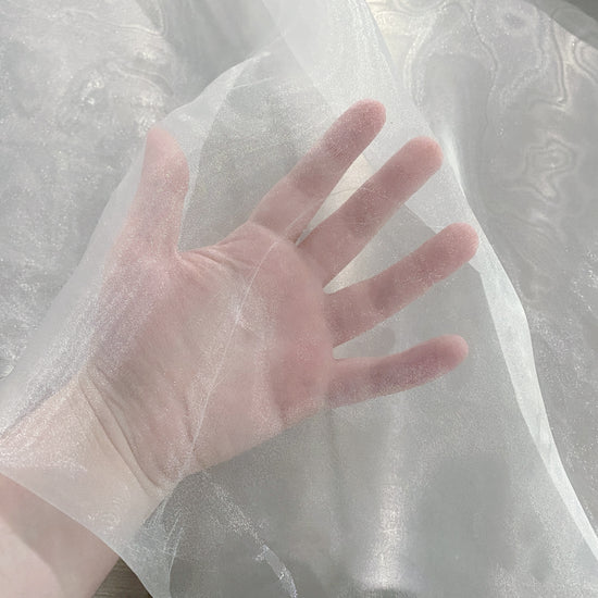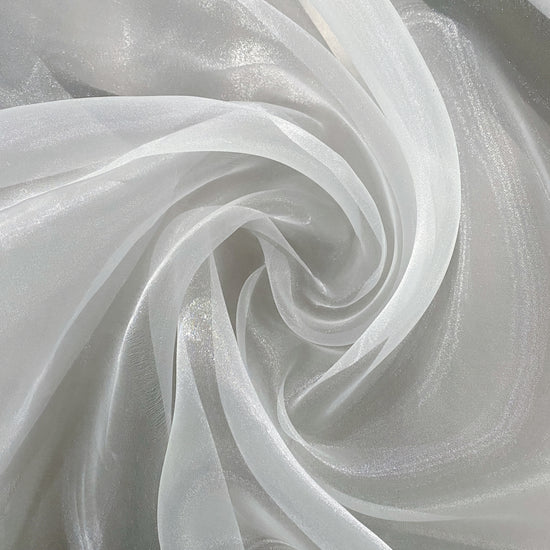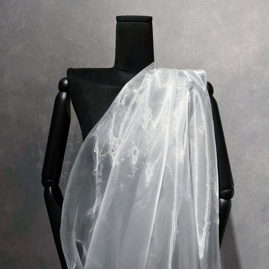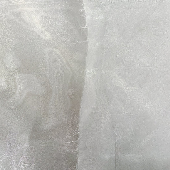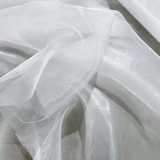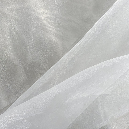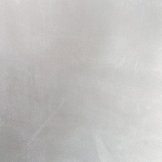Polyester organza in White. This lightweight fabric has a fine plain weave with a grainy metallic lustre and a dry handle. It has a structured drape, sheer coverage, and no give in either direction.
