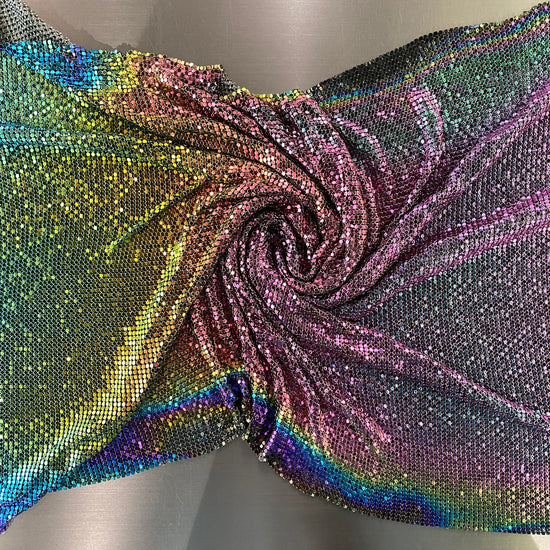 A light weight, (for glomesh) semi-opaque, no give glomesh with holographic appearance, malleable, cool, metallic handle and sound with fantastic, slinky drape.