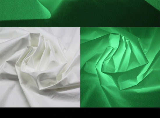 Cotton bonded PU in White/Yellow Green. This heavyweight fabric has a smooth polyurethane surface, bonded to a cotton backing. It features photochromic properties (UV reactive); morphing within an intermediate colour gradient from white to yellow-green. It has a structured drape, opaque coverage, and no stretch.
