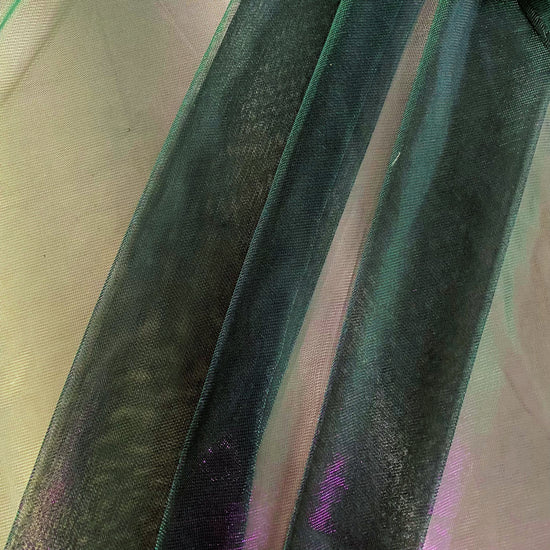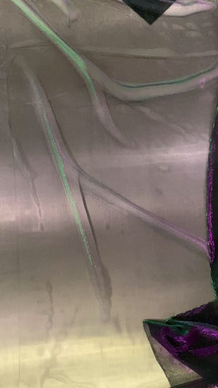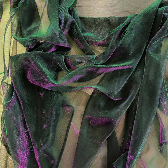 Polyester raschel knit in purple/green. This light weight fabric has a loose raschel structure, with a ribbed handle and metallic dichromatic sheen. It has a fluid drape, sheer coverage, and stretches across the salvage.