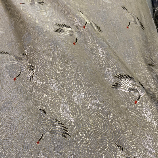 Polyester-nylon blend satin jacquard in Silver/Gold. This medium weight fabric has a fine satin jacquard weave, featuring traditional crane and cloud motifs ornately woven on a satin base. It has a structured drape, opaque coverage, and no stretch.