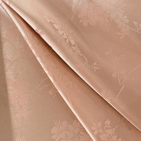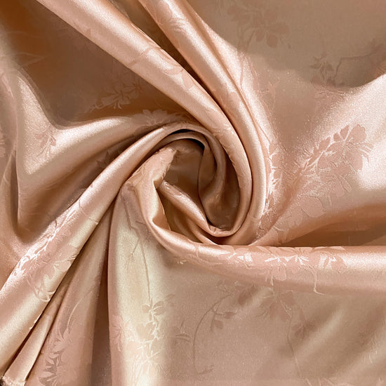 Silk-polyester blend satin jacquard in Misty Rose. This lightweight fabric has a fine satin jacquard weave with floral motifs, a lustrous sheen and a smooth handle. It has a fluid drape, opaque coverage, and slightly stretches across the salvage.