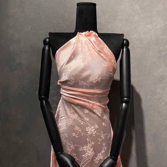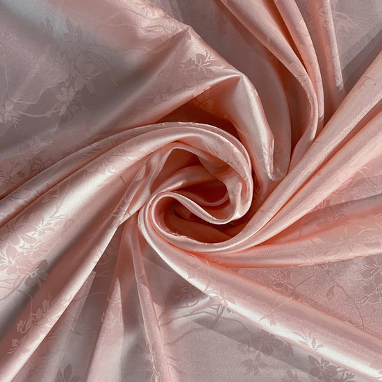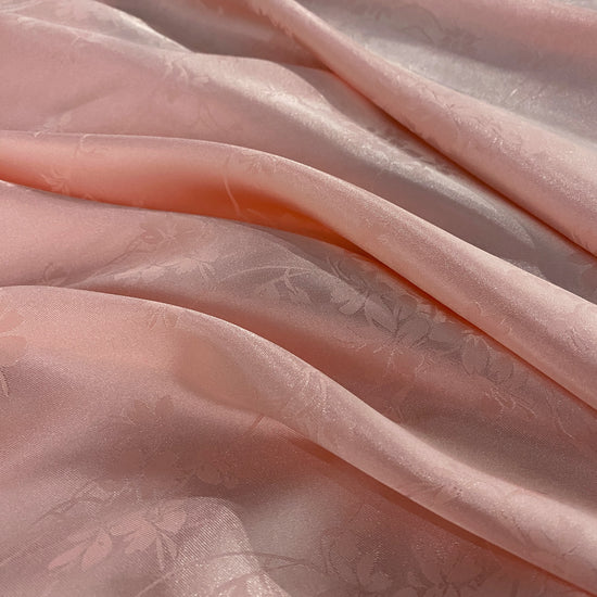 Silk-polyester blend satin jacquard in Papaya Whip. This lightweight fabric has a fine satin jacquard weave with floral motifs, a lustrous sheen, and a smooth handle. It has a fluid drape, opaque coverage, and slightly stretches across the salvage.