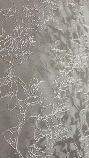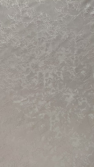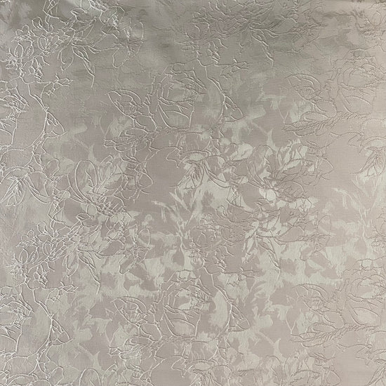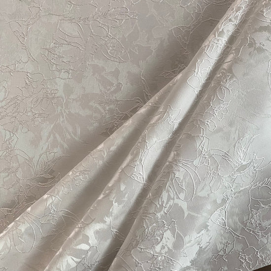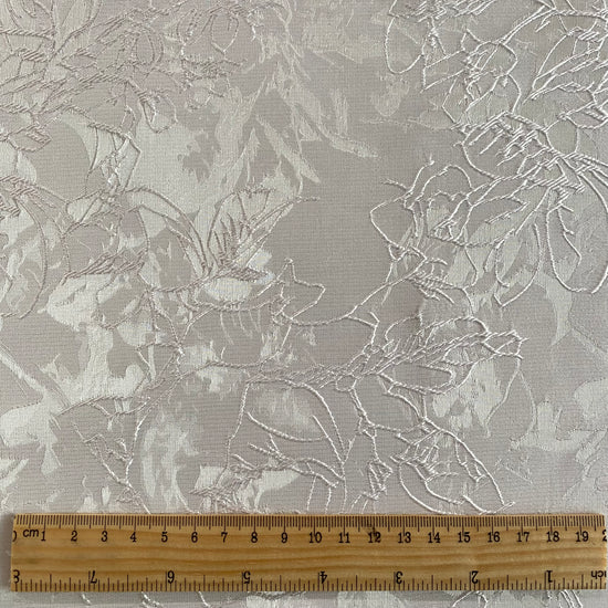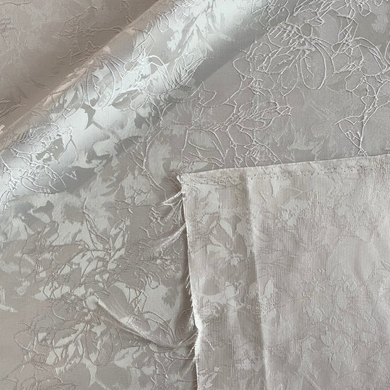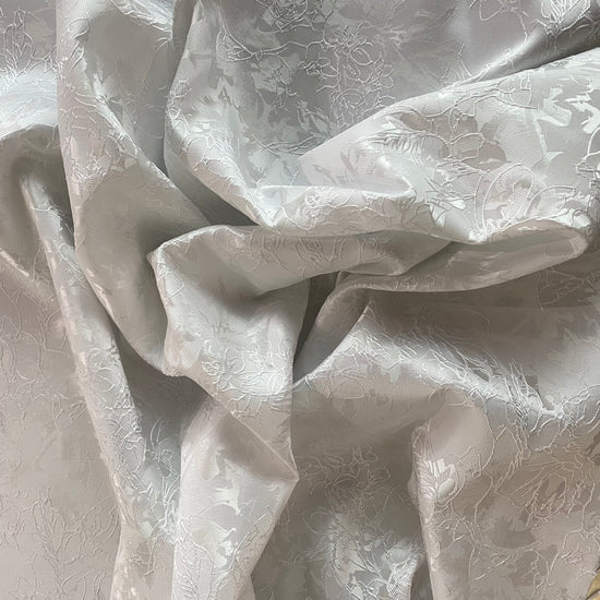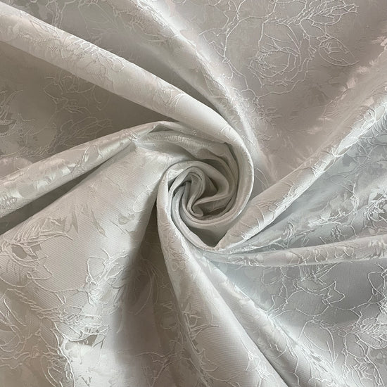 Polyester jacquard in White. This medium weight jacquard has been tightly woven in a satin structure, featuring a lustrous sheen and a raised embroidered handle. It has a structured drape, opaque coverage, and no stretch.