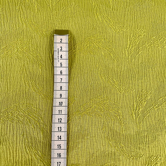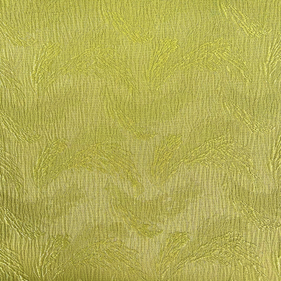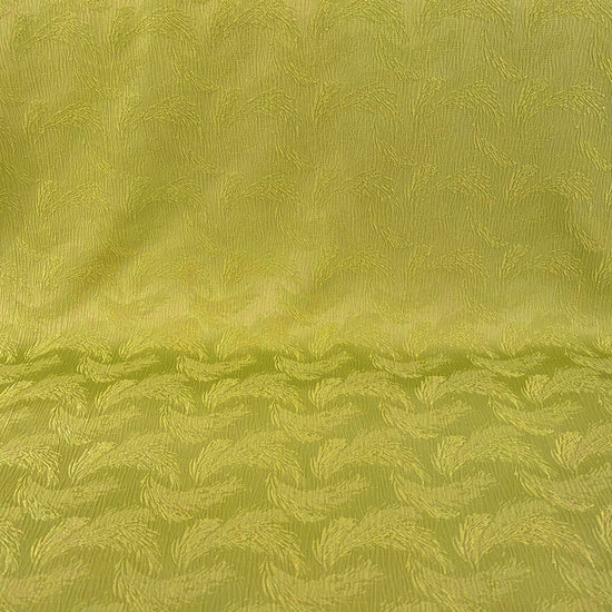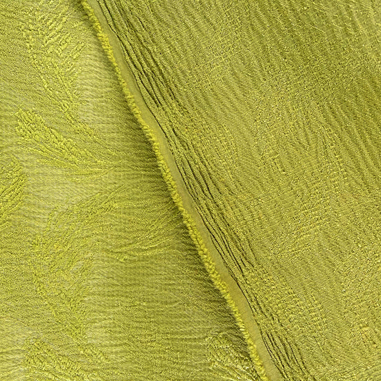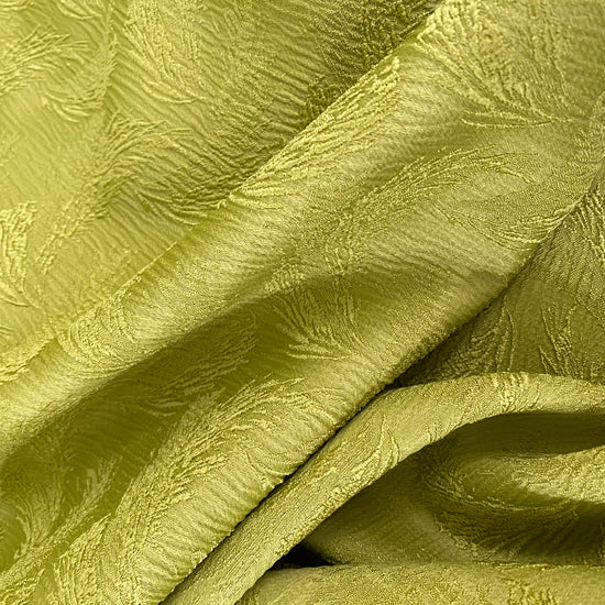 Polyester-cotton blend jacquard in Green. This medium weight fabric has a fine jacquard weave, featuring floral motifs with a raised, rippled handle, and a subtle sheen. It has a soft drape, opaque coverage, and no stretch.