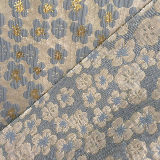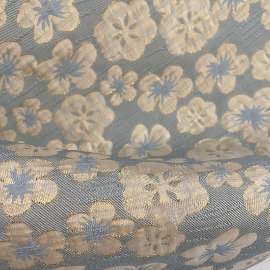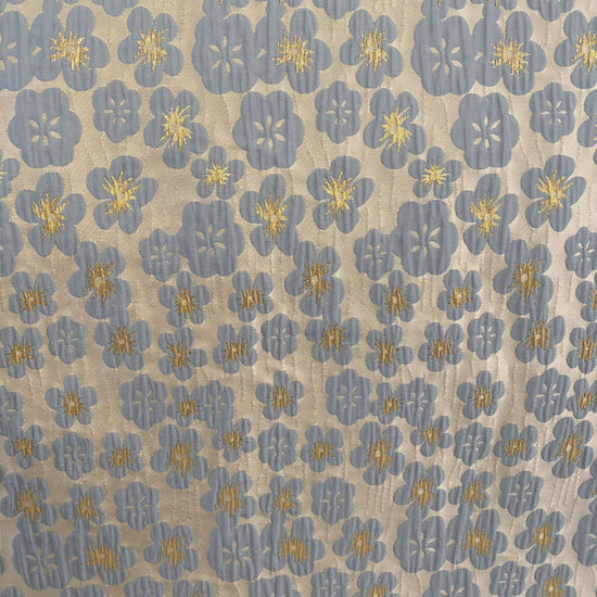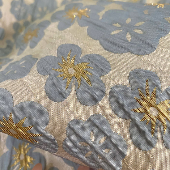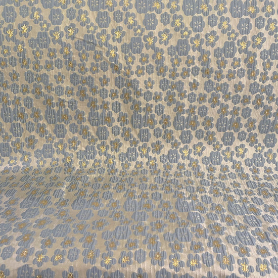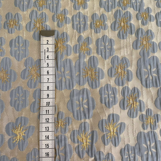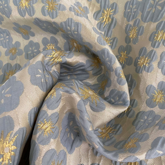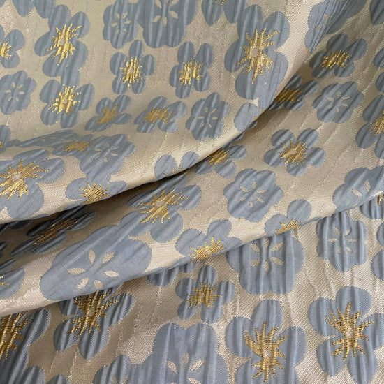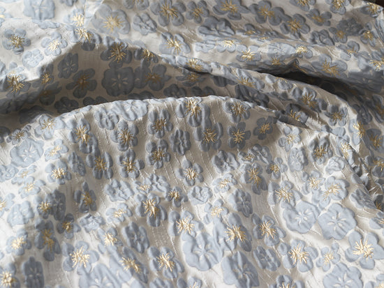 A medium weight, opaque brocade with a wrinkled, metallic daisy motif, structured drape, a lightly corrugated handle and no stretch.