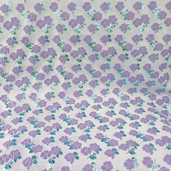A structured drape, purple/turquoise/light grey floral brocade with turquoise metallic leaves with a metallic, firm handle.