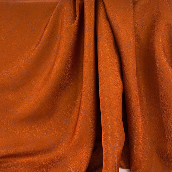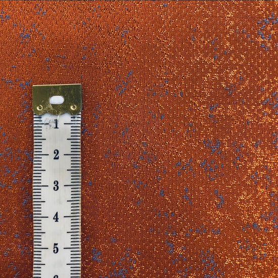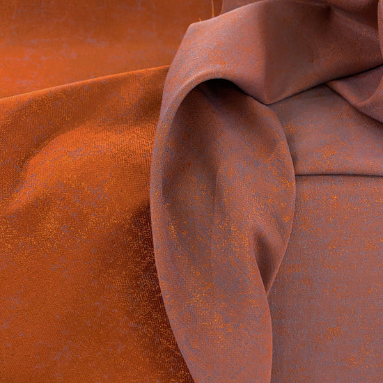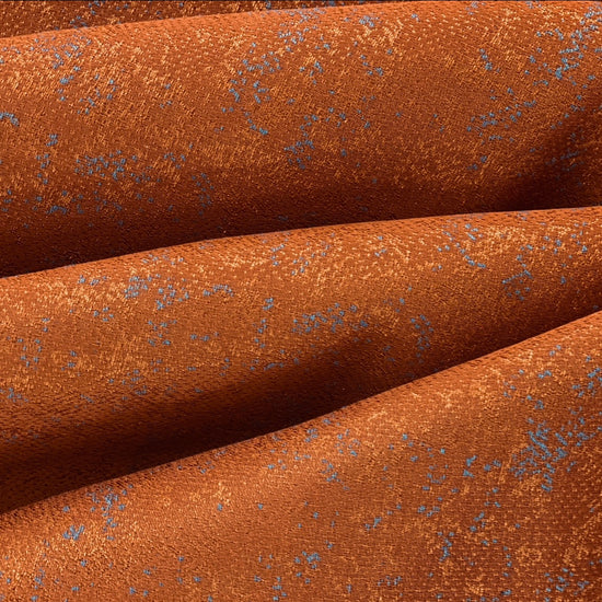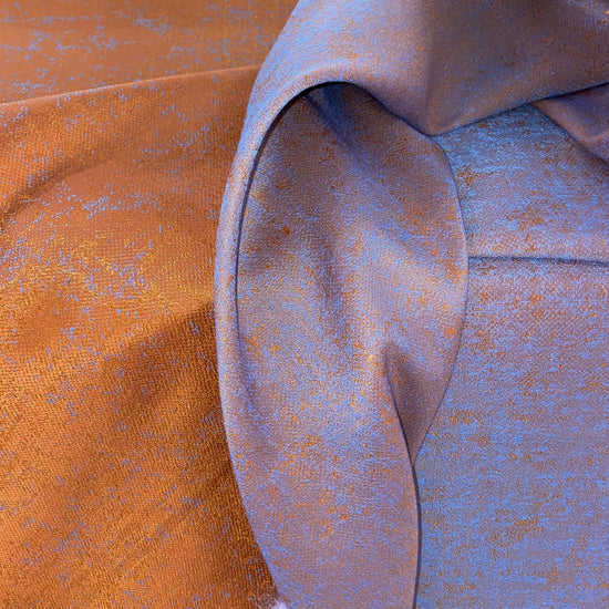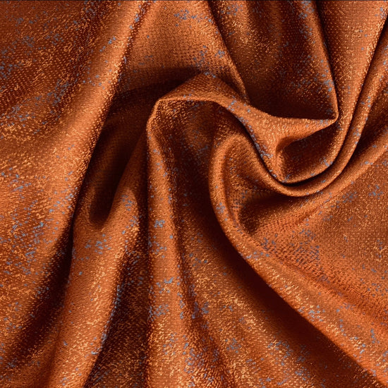 Subtle burnt orange and cornflower blue patina motifs. A medium weight jacquard with a soft sheen and subtle metallic detailing. Good, structured drape. No give with a light upholstery handle.