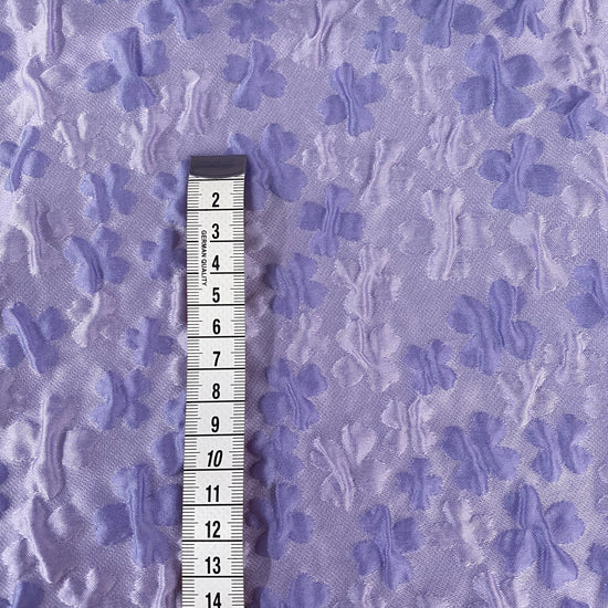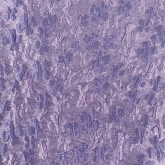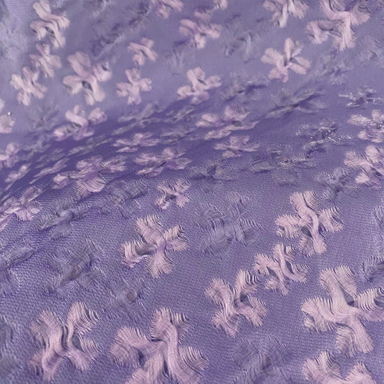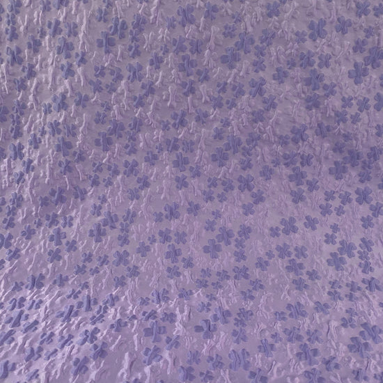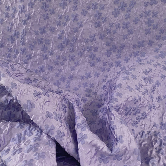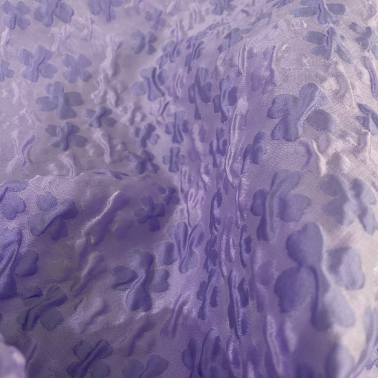 Polyester blend brocade in Purple/Pale Violet. This medium weight fabric has a fine brocade weave with raised, rippled clover motifs and a subtle lustre. It has a semi-structured drape, opaque coverage, and no stretch.